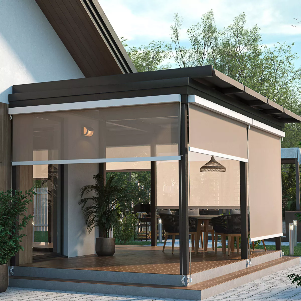 в открытых и полуоткрытых пространствах. Фактор открытости 5% хорошо рассеивает яркий солнечный свет, создавая мягкое освещение, и в то же время не препятствует нормальной циркуляции воздуха, избавляя от духоты в помещении.